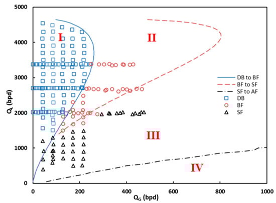 Flow pattern map for GC-6100 ESP at 2400 rpm and 150 psig [].