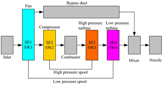 where the subscript denotes the fan, the compressor, the high pressure turbo and the low pressure turbo, respectively. is the actual efficiency and flow capacity of the ith component, and is the ideal efficiency and flow capacity of the ith component. The health parameters are marked in a corresponding component in Figure 1.