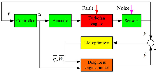 A diagnosis method based on the LM algorithm is proposed in this paper. The LM algorithm is utilized to estimate the operating point in the characteristic maps of each component. Then, the fault diagnosis and the performance estimation are implemented according to the estimated operating point. The steady and dynamic model error is considered in this paper and represented by the difference between two component-level-model with distinct computing methods. The process noise and measurement noise are represented by Rayleigh noise and Gaussian noise, respectively.