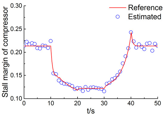 From the tracks of the acceleration process and the deceleration process shown in Figure 7, it can be easily found that the proposed method has the ability to effectively estimate the actual value of efficiency and flow capacity in a wide operation range of the turbofan engine. Figure 8 depicts the fact that the RMSE is less than 0.3% for all measurements. The performance estimation results of the transient case are depicted in Figure 9, Figure 10 and Figure 11, and it is clear that the estimated performance parameters obtained from the diagnosis engine model are matched well with the actual reference performance parameters of the reference engine model. The RMSE of the thrust, the surge margin of fan, and the surge margin of compressor are 0.31%, 0.44%, 0.55%, respectively.