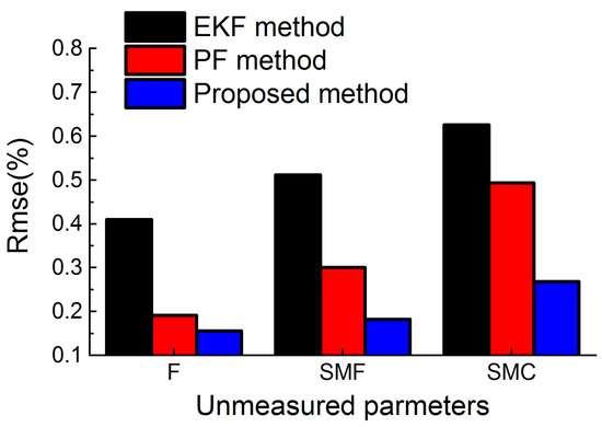 Figure 16 depicts the classification correct rate of 11 fault patterns. The average correct rate of 11 fault patterns through three methods is 83.82%, 85.07%, 93.19%, respectively. The misdiagnosis rate of the proposed method decreases 57.91% compared with the EKF method, and decreases 54.39% compared with the PF method.