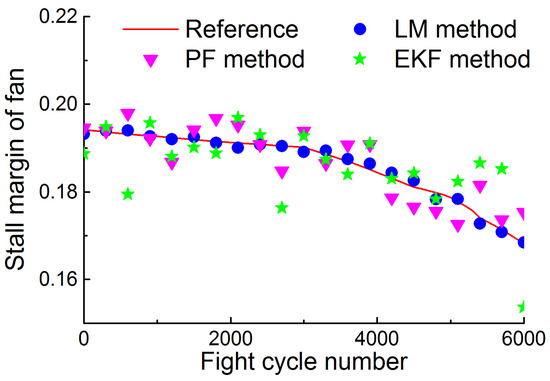 Figure 19, Figure 20 and Figure 21 depict the performance estimation in the gradual degeneration case obtained through the proposed method, PF method, and EKF method. As can be found in Figure 19 and Figure 20, the thrust and the surge margin of fan decrease along with the gradual degeneration, which implies that the degenerated engine may not be able to provide sufficient thrust and work reliably. The accuracy of performance estimation through the three methods is given in Figure 22. The mean RMSE through the proposed method, PF method, and EKF method is 0.0686%, 0.5396%, 0.7368%, respectively.
