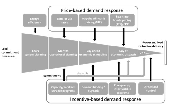 The demand response can be categorized as (1) price-based and (2) incentive-based. Price-based demand response assumes that electricity consumers will alter their electricity consumption due to a price signal that is provided at a different time []. Meanwhile, incentive-based demand response assumes that electricity consumers can achieve rebates or billing credit if they alter their consumption due to a technical signal []. The role of demand response in the electric system planning and operations is visualized in Figure 1.