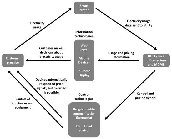 Consumers’ knowledge and awareness can be enhanced via educational and informational campaigns []. Also, the feedback of energy consumption allows raising industrial consumers’ energy awareness, which can be divided into four categories: direct feedback, indirect feedback, inadvertent feedback, and energy audits []. The types of feedbacks have a major impact on the energy-awareness and consumers’ attitudes toward energy consumption []. Meanwhile, some feedback measurements can be activated after smart meter implementation, such as availability of real-time pricing.