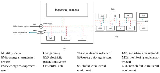 Figure 3b illustrates a task’s structure that includes: (1) monitoring and control system (MCS), (2) energy management agent (EMA), (3) power source switch, and (4) controllable (CE), shiftable (SE)-, and non-shiftable industrial equipment (NSE). The shiftable industrial equipment can be turned on/off to balance the electricity supply and demand. The electricity demand for non-shiftable equipment (non-scheduled) must be satisfied right away. The controllable equipment (e.g., packaging machine), is the equipment that supports processes on different levels of operations with different electricity demands. As a rule of thumb, some of the schedulable category equipment should be controllable or shiftable [].
