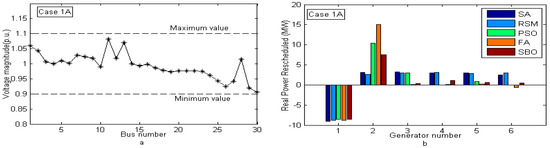 The voltage magnitude was obtained after CM using SBO, and is shown in Figure 1a. It is observed that, after CM, the voltage magnitude is within limits between 0.9 and 1.1. A comparative graphical representation of the real-power rescheduling and congestion cost with different algorithms is shown in Figure 1b,c. The system real-power losses reduce from 16.13 MW to 12.665 MW after the CM.
