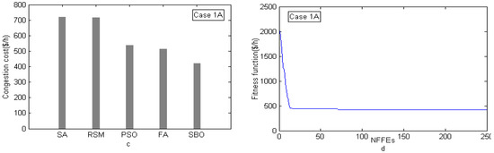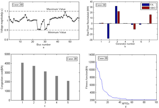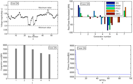 In Case 2A, the line limits were reduced to 175 MW and 35 MW in the lines 5–6 and 6–12, instead of 200 MW and 50 MW. The details of the congested line flow before and after CM are provided in Table 2. Due to this congestion, lines between 5–6 and 6–12 get overloaded and the total power violation becomes 28.22 MW. The optimum value of the generator real-power rescheduling performed using the proposed SBO algorithm completely alleviates the violation of the overloading lines. Table 4 shows the minimum cost achieved by the proposed SBO method compared to those achieved by earlier algorithms. The SBO method-based bus voltages, as obtained after the application of CM, are displayed in Figure 3a and are acceptable. The real-power rescheduling and congestion cost of the proposed SBO method compared with that of other algorithms is shown in Figure 3b,c. Figure 3d shows the convergence profile. The total system loss before CM was 69.64 MW; this decreased to 24.558 MW after the CM.