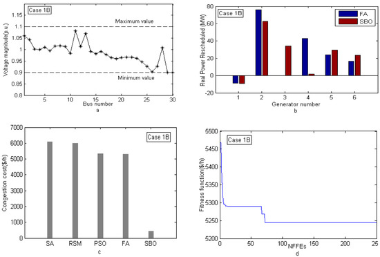 In Case 1B, outage of line between 1 and 7, along with the increase in load to 1.5 times as much, causes overloading in the lines 1–2, 2–8, and 2–9. Table 2 shows the line flows in between the overloaded lines in this case. Table 3 illustrates the results for minimization of the congestion cost and changes in the real power of generators. A comparative graphic view of the change in real-power of generators and total congestion cost is presented in Figure 2b,c. The cost for CM is less for the proposed SBO method than for the other comparative methods. In addition, the total system loss is initially 37.24 MW; after CM, it reduces to 14.59 MW. Figure 2a shows the proposed SBO method-based variation in output voltage at all the buses after the CM.