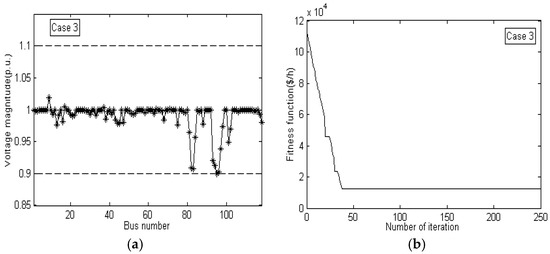The data in Table 5 list the cost of the congestion and generator real-power rescheduling obtained by SBO algorithm compared with those of other algorithms given in literature. From Table 5, it is made clear that overloaded lines are totally relieved by generation rescheduling with the cost of 12,336.05 $/h, which is the lowest when compared with all other optimization algorithms enlisted in [22] such as evolutionary programming algorithm (EP), real coded genetic algorithm (RCGA), particle swarm optimization (PSO), hybrid particle swarm optimization (HPSO), and differential evolution (DE). The loss of the total system before CM is 277.301 MW, and is then decreased to 230.505 MW. Further, it is assessed through the tests that the SBO provides the best optimal solution in every independent trial run and continues to be consistent even for large systems as well. The bus voltage and convergence profile obtained after the CM are plotted in Figure 5. Figure 5a shows the voltage magnitudes at all the buses.