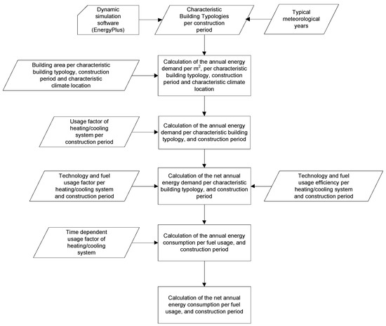 Climatic data used in the model refer to typical meteorological years. These were extracted from the Meteonorm database and software (which contains climate data from more than 8000 weather stations around the world and provides software that generates representative typical years for any region—www.meteonorm.com) for the three reference climate regions (hot, moderate and cold) of Cyprus. The hot climate region represents the southern coastal areas of the island, the moderate climate is characteristic for the mainland areas, while the cold region represents the mountainous areas of the island. With the aid of these data, dynamic simulations of the characteristic building typologies were performed using the EnergyPlus software, an acclaimed dynamic energy simulation software primarily used for modelling building energy efficiency [14], taking into consideration typical indoor conditions and usage patterns, retrieved by previous analysis [15]. Other input data, as illustrated in Figure 1, are: