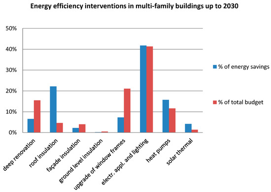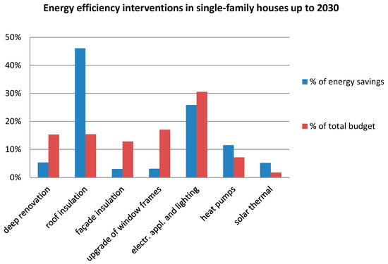 Taking into consideration the mix of renovations shown in Table 8 and the corresponding costs of each type of renovation, Figure 2 and Figure 3 illustrate the allocation of the available budget to each measure and the corresponding contribution of each measure to total energy savings, for single- and multi-family buildings respectively. From a purely economic perspective, for each renovation type the height of the blue and the red column should be equal; this would imply equal costs per unit of energy saved—which is theoretically the criterion to attain economic efficiency. However, real-world considerations indicate that the cost per kWh cannot be the sole decision criterion:
