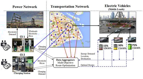Electrified vehicles (EVs) can help reduce national gasoline consumption, greenhouse gas emissions and dependency on foreign oil since they operate partly or entirely on inexpensive electricity. Electricity needed to charge the EVs can be potentially obtained from local, renewable, and less carbon-intensive energy sources [,]. However, the incorporation of a large number of EVs into existing power and transportation infrastructures remains a challenging task that needs to be addressed soon []. According to [], China has increased EV utilization vigorously since 2009. The target production and sales numbers of battery-only EVs and plug-in hybrid EVs are expected to be 0.5 million until 2015 and 5 million until 2020 []. Furthermore, in the U.S., the government has pledged US $115 million for the installation of electric vehicle charging infrastructure around the states. This ever-increasing use of electric vehicles and charging stations, may affect both power and transportation networks.