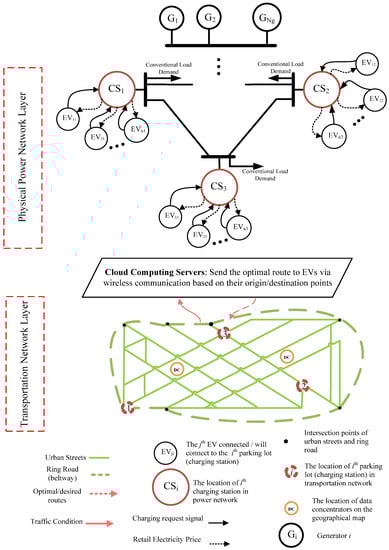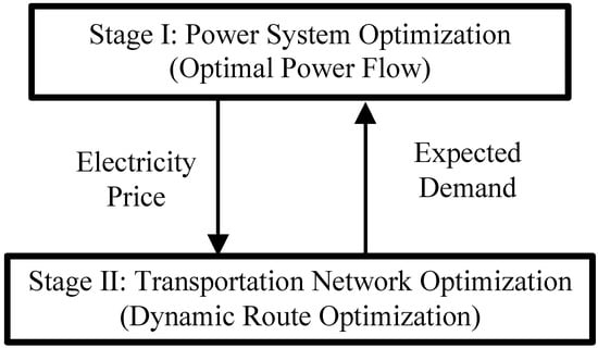 The general framework of two-stage optimization problem is shown in Figure 2. As illustrated in the figure, electricity prices are communicated from electric power network to the transportation network. Furthermore, the expected charging demand of each EV charging station is communicated to the power network for updating the results of optimal power flow problem. A more detailed model of our proposed framework is represented in Figure 3. According to this figure, physical network layer includes three main elements and one sub-level element. Power generation units, conventional load demand (before adding parking lots with EV charging capability), and charging stations connected to power network are the main elements. EVs are considered as the sub-level element. After the charging stations receive the locational marginal electricity price from the independent system operator (ISO), send the charging price based on their incentivizing strategy to EVs. The transportation layer is coupled with power network via EVs with different sizes of battery packs. The price signals and EV demand at each charging station are the shared variables. Once, EVs receive the electricity prices from the charging stations, cost-optimal routing is done using traffic information, battery initial state of charge, battery size, and changing EV powertrain efficiency under different traffic conditions.