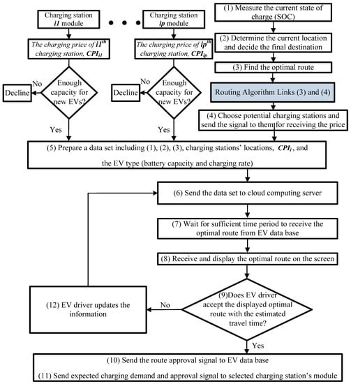 The EV module represented in Figure 4, includes the information flow inside each single EV and the data communication between charging stations and cloud EV data center. The Routing Optimization Algorithm which is mentioned in Figure 4, will be elaborately introduced in Figure 5.