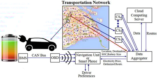 The percentage of the trip that will efficiently be covered on electricity before the need for a recharge or battery swap depends on the vehicle type, battery size, initial battery state of the charge (SOC) and traffic conditions []. The proposed routing strategy in this paper, illustrated in Figure 5, takes into account all the aforementioned factors and provides least-cost optimal path. The Battery Management System (BMS) provides the battery information via the wired or wireless On Board Diagnostics (OBD) scanner that can access the information on the Control Area Network (CAN) bus of the vehicle. The data collection unit sends the vehicle data (location, destination, current state of charge, and battery size.) to the data aggregator. Data collection device can be a smart phone or GPS device. The data aggregator sends the vehicle and the transport network information to the cloud server and gets the electricity price and the optimized routes to the destination passing through the optimum charging station for each individual EV. This information is then send to the EV’s data collection unit and the driver is informed about the optimal routes.