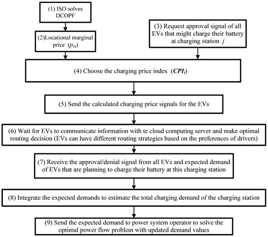 There are studies focused on power system optimization problem while considering the impact of EVs on the electricity demand. Yang et al. in [] proposed a distributed mixed optimization approach to solve the joint scheduling problem of large-scale smart appliances and batteries. Their objective is to minimize electricity payment, user’s dissatisfaction and battery loss considering the corresponding constraints. Furthermore, they formulated the battery scheduling problem as a mixed-integer linear program which is solved using Benders decomposition technique. In [], You et al. moved one step further and proposed a model of a battery switching station (BSS) for electric buses (EBs) to solve the EV battery charging scheduling problem. In their model, every EB determines a battery available for switching. In order to compute the optimal schedule, they utilized the dual decomposition to decouple the charging decisions at various charging boxes []. The main advantage of our proposed method compared with this study is considering the transportation network model by deploying the optimal routing to determine the EV charging demand. Bashash et al. evaluated the charge pattern optimization of plug-in EVs by defining the timing and rate of obtaining electricity from the power systems. Although they minimized the total cost of electricity and gas as well as the battery health degradation simultaneously [], the interdependent effects of power and transportation networks are not captured in their proposed solution. Xiong et al. proposed a systematic simulation framework to analyze the effect of plug-in EV charging stations on the power distribution system and transportation networks []. Although their method considered some aspects of power and transportation networks, the optimal vehicle routing and the traffic conditions have not taken into account while simulating the transportation network. Further, the communication between EVs and charging stations regarding the charging transactions based on different price schemes was not considered in these studies, which is one of the major contributions of this paper.