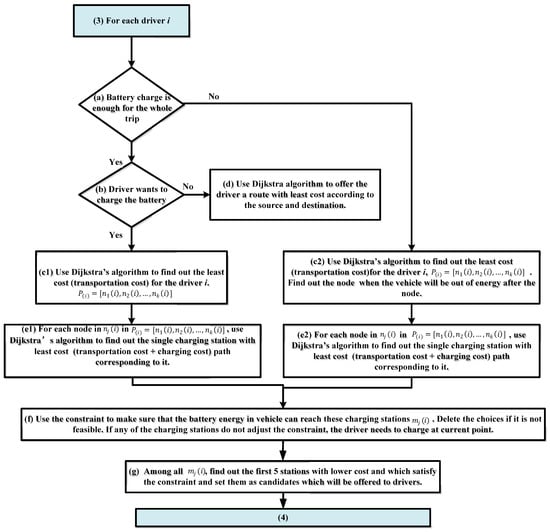 When the travel path is determined for drivers using VPCRO [], Breadth-first-search (BFS) algorithm [] is applied to search nearby charging stations for drivers. BFS is a method for exploring a graph/tree data structures. It begins at the tree root (initial point for the EV drivers) and explores the neighbor nodes first, before moving to the next level neighbors. For each node among the travel path, we find the nearest charging station to reach one located on the optimal route. Then we choose five candidate charging stations among these cases. Offering several charging stations helps the drivers to have more options to decide for charging their battery. After finding five nearest charging stations, we proceed with choosing the charging station with least cost.