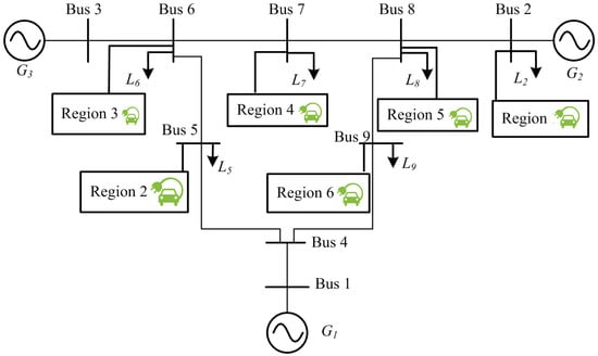The one line diagram of modified IEEE 9-bus test system before load demand modifications is depicted in Figure 8 and updated parameters are shown in Table 2. As shown in the figure, there are six regions for charging stations. These regions are connected to the power system using six distinct buses.