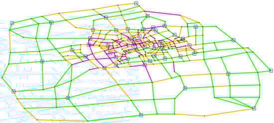 According to [], the number of EVs in China is estimated to be 0.3 million in 2015. 15% of these vehicles are estimated to be used in Shanghai []. In order to obtain a practical test system, we evaluate our proposed framework by considering 45,000 EVs. The details of the modeling of the Shanghai transportation network is given in Section 2.3. Figure 9 illustrates the Shanghai constructed traffic network for the simulation purposes based on Google map information and Figure 10 shows the charging stations in each region based on their electrical connection point to the power network. The light, medium and heavy conditions are denoted with three colors: green, orange, and purple, respectively and charging stations are represented with squares.