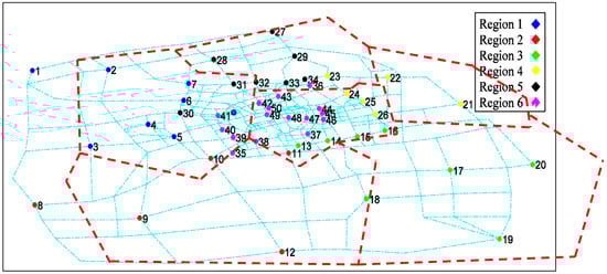 We modify the load demand values at the load points. The updated values are shown in Table 2. This table also includes the maximum number of EVs that can be served (parked and charged) in each region. Charging stations at each region are connected to the power network via specific load points as shown in Figure 8.