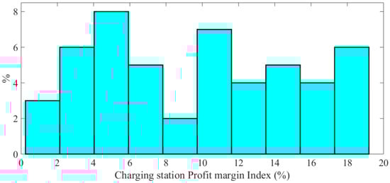 We assume that each charging station uses a fixed charging price which is determined by the charging station facility based on the number of charging requests, the location of charging station (downtown, vicinity, or residential area) and other factors of interest. We define the Charging station Profit-margin Index to represent the profit margin of charging stations as the difference between the price determined by the charging station and the locational marginal price sent by ISO. This index shows the percentage of the price deviation for the profit of charging station. If the locational marginal price at the charging station bus is shown as and the offered price to EVs by the ith parking lot is denoted by then the Charging station Profit-margin Index, denoted by can be calculated using the following equation: