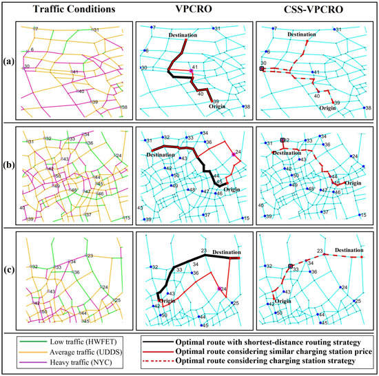 The key contribution of this study is to propose a comprehensive framework that takes the interdependent nature of power and transportation networks into account and the routing strategy is only one part of the proposed framework. Further, we developed a novel routing strategy which is competitive with the current applications in the EV market for the routing purpose, such as Tesla Model S traffic-based routing software [], in terms of considering practical constraints from both power and transportation networks, e.g., varying electricity price signals and traffic conditions. Figure 12 shows the impact of our proposed methodology for the optimal joint operation of transportation and power networks on the cost-optimal routes of randomly selected three electrified vehicles from our case study. Columns of the Figure 12 show (1) the traffic conditions of the transportation network; (2) cost-optimal routing result using VPCRO and finally (3) cost-optimal routing result using CSS-VPCRO from left to right. Rows a–c in Figure 12 denote the cases for three different EVs. The blue points represent the available charging stations and the squared blue points represent the selected charging station on the cost optimal path. For the first randomly selected EV (Figure 12a) in the first scenario that is shown in the middle map, charging stations 39, 40, 41, and 42 have the same electricity price (5 cents/kWh) because they are located in the same region. Thus, CPI = 0% for all charging stations. VPCRO chooses charging station 41 since it is in the proximity of the cost optimal route. The reason for not choosing charging stations 39 and 40 (while having the same charging cost as 41) is the maximum achievable SOC at the destination. In other words, if the driver charges its EV at 39 or 40 to a certain level, the battery SOC will be less that the case of charging at 41 to the same SOC. In the second scenario for the first EV (right map), the CPI values for charging stations 6, 39, 40, 41, and 30 are 9.9%, 10.8%, 11.3%, 7.6%, and 1.1%, respectively. The new routing result shows that although there are three charging station located on the optimal route, our algorithm selected charging station 30 as the optimal one to purchase electricity. The reason for not choosing charging station 6 with the lower price (4.8 cents/kWh) is the heavy traffic conditions. As the left map in Figure 12a represents, the whole path to reach charging station 6 is under heavy traffic condition (purple color). However, some parts of the path towards charging station 50 have average traffic which makes it a more optimal option. Similar explanations hold for the second EV (Figure 12b). For the third EV, the CPI value of charging stations 33 and 24 in the second scenario are 1.5% and 9.2%, respectively. Hence, the routing algorithm chooses charging station 33. Results show that interaction of EVs with charging stations during vehicle routing changes the optimal routes. It is also worth noting that there is a trade-off between travel time and charging cost for some cases, for instance, the shortest distance routing strategy provides a faster route compared with the case that we consider the charging station pricing strategy in Figure 12c.