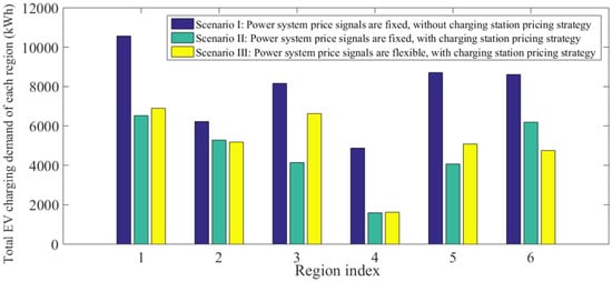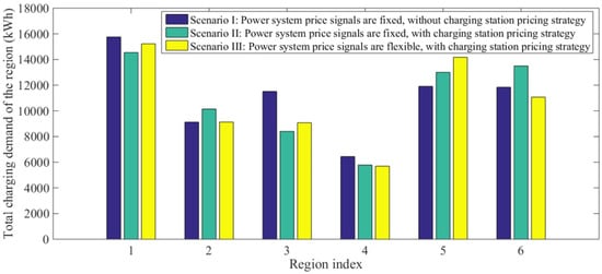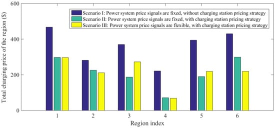 According to Figure 14, fixed price signals without a charging station pricing strategy will lead to higher charging cost compared to the cases where the charging stations change the price signals. Furthermore, for scenarios II and III (with a charging station pricing strategy), after considering the price variations of power systems, the charging cost of some regions will increase. It shows the impact of different electricity price values on the optimal routing strategy of EV drivers. In other words, when there is a cheaper charging station in another region, EVs prefer to choose a more energy-consuming route to charge their battery more economically. As we mentioned, the EV drivers optimize their charging cost. Hence, they might choose a longer distance which leads to a lower charging cost by using a cheaper charging station. The price difference between scenarios II and III is not considerable. The reason is the small variations of electricity price due to charging demand effect on the power systems operation.