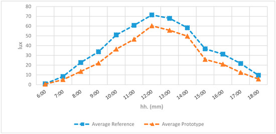 For the better presentation of the data, the records of each luximeter were reduced to the hourly average. Subsequently, the hourly mean was extracted from the 10 days resulting in an average day representing the validation time as shown in