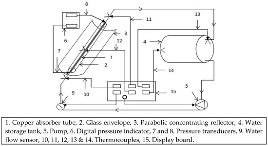The schematic diagram of the CPCSWH (cylindrical parabolic concentrating solar water heater) experimental setup.
