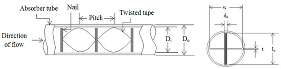 Initially, the experiment was conducted with a plain copper absorber tube and the next experiments were conducted by inserting the NTT into the absorber tube, one by one, with varying nail twist pitch ratios (4.787, 6.914 and 9.042). Aluminium strips were used to manufacture the twisted tape and mild steel headless screws were inserted into the previously drilled holes at a twist pitch distance over the length of the twisted tape. The experiment was conducted from the 25 April of 2017 to June of 2017 and during the time period of 9:00 a.m. to 15:00 p.m. and the experimental works were conducted at Indian Institute of Technology (Indian School of Mines) Dhanbad (latitude 23°47″ N and longitude 86°30″ E), a city situated in the northeast region of India (country), with an elevation of 232.0 m (approx.) above mean sea level (MSL).