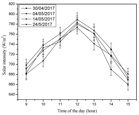 Figure 5 presents the variation of solar intensity with time. From this figure, it is very clear that the slope of solar intensity increases from 9:00 a.m. to 11:00 a.m. and after that its slope increases slowly until noon. The peak values of solar intensity are observed at 12:00 a.m. After 13:00 p.m., the value of solar intensity starts to reduce, with a higher decreasing rate until 15:00 p.m.