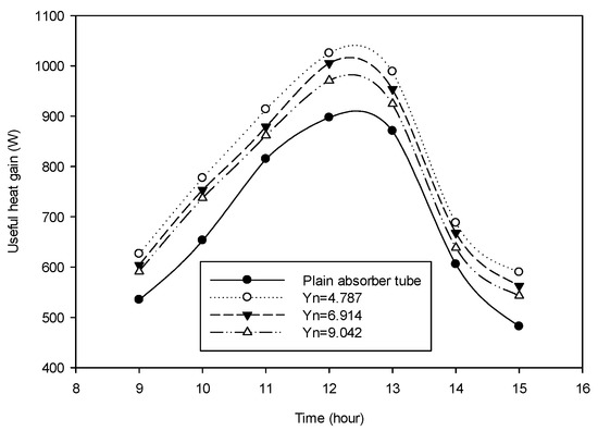Figure 6 shows the variation in useful heat gain with time for the plain absorber tube and the absorber tube with NTT inserts. The useful heat gain changes progressively with time, from 9:00 a.m. to 12:00 a.m., and then starts to deteriorate from 12:00 a.m. to 15:00 p.m., as shown in Figure 6. The useful heat gain is maximum at noon when solar intensity is maximum. The variation in useful heat gain follows the path of variation in solar intensity. Also, useful heat gain increases with a smaller nail twist pitch ratio. This is owing to the fact that swirl flow and turbulence are induced by the NTT. Also with a smaller nail twist pitch ratio, the tape twist pitch decreases and the number of nails increase, which, in turn, deeply intensifies swirling and turbulence. The combined effect increases heat transfer time and the rate of heat transfer from the absorber tube to flowing circulating water. Due to this, useful heat gain increases. In the present experimental study, the maximum useful heat gain increased by 12.462% for a nail twist pitch ratio of 4.787, 10.753% for a nail twist pitch ratio of 6.914 and 7.591% for a nail twist pitch ratio of 9.042 than useful heat gain obtained from the plain absorber tube. Therefore, useful heat gain, obtained from the absorber tube with NTT inserts, are found to be much higher than that in the plain absorber tube.