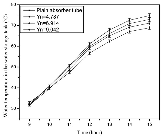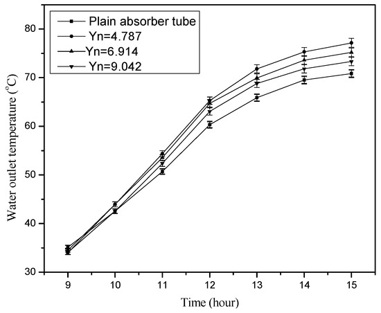 Figure 7 indicates the variation of the water outlet temperature with time, whereas Figure 8 indicates the water temperature in the water storage tank with time, for different nail twist pitch ratios (4.787, 6.914 and 9.042). These figures clearly show that the water outlet temperature and water temperature in the water storage tank both change positively with higher incremental rates, from 9:00 a.m. to 12:00 a.m., as solar intensity increases during this time period. From 12:00 a.m. to 15:00 p.m., the water outlet temperature and the water temperature in the water storage tank both increase slowly and the NTT insert absorber tube improves these temperature results. This is due to the fact that the stored water is flowing through the absorber tube to the water storage tank and from the water storage tank to the absorber tube (i.e., a closed-loop system) and hot water, stored in the water storage tank, is entering the absorber tube to absorb the concentrated solar energy from the absorber tube. There is neither fresh water entering into the system, nor energy withdrawing from the system. Stored hot water is being heated again and again, only during the experiment. Also, the water outlet temperature increases for the NTT inserts absorber tube with a smaller nail twist pitch ratio, due to swirl flow and turbulence, created by the tape twist and nail of the NTT inserts absorber tube. Also, the water temperature in the water storage tank is affected by the same influences of the NTT. During the experiment, the maximum water outlet temperature was found to be 77.170 °C for a nail twist pitch ratio of 4.787 at 15:00 p.m. Therefore, it is very transparent that the water temperature in the water storage tank follows the path of variation of the circulating water temperature at the outlet of the absorber tube.