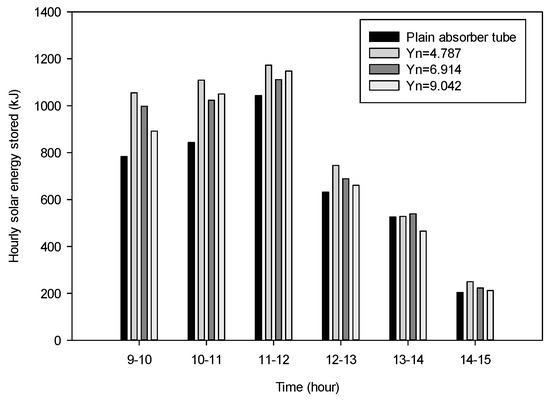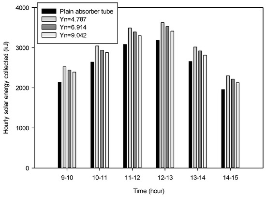 The hourly solar energy collected vs. time is shown in Figure 9. The hourly solar energy collected increases, from 9:00 a.m. to 11:00 a.m., at a faster rate and reaches a peak value at noon. After noon, its value again decreases and reaches a minimum value. From this figure, it is also clearly observed that hourly solar energy collected enhances, with a significantly faster rate from 9:00 a.m. to noon and after noon it begins to decay. Therefore, hourly solar energy collected follows the path of variation of incident solar radiation and useful heat gain. From the present experimental investigation, the maximum values of hourly solar energy collected are observed during the time interval between 12:00 a.m. and 13:00 p.m. Also, the maximum value of hourly solar energy collected was found to be increased by 12.189% for a nail twist pitch ratio of 4.787, 9.770% for a nail twist pitch ratio of 6.914 and 6.733% for a nail twist pitch ratio of 9.042, compared to the same obtained for the plain absorber tube. This is because of the swirl flow and turbulence induced by the NTT inserted absorber tube. The combined effect increases the useful heat gain that, in turn, increases the hourly solar energy collected.