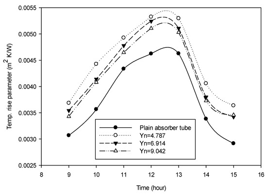 Figure 11 indicates the variation in temperature rise parameter with time for the nail twist pitch ratios, 4.787, 6.914 and 9.042, respectively. This figure clearly shows that the temperature rise parameter increases with a higher rate, from 9:00 a.m. to 11:00 a.m., as the solar intensity increases and after that, it attains a maximum value at noon. After 13:00 p.m., its value decreases to a minimum value with a faster rate, as storage hot water is circulating through the absorber tube and this results in very little increase in water outlet temperature at the absorber tube. Therefore, the temperature rise parameter decreases and follows the path of variation of solar intensity. Also, the temperature rise parameter increases for the NTT insert absorber tube with a smaller nail twist pitch ratio, as swirl flow and turbulence, created by the tape twist and nail of the NTT inserts absorber tube and the smaller nail twist pitch ratio deeply intensify the swirling and turbulence. From the present experimental study, it has been observed that the maximum value of temperature rise parameter is increased by 13.168% for a nail twist pitch ratio of 4.787, 11.815% for a nail twist pitch ratio of 6.914 and 9.444% for a nail twist pitch ratio of 9.042, compared to the result obtained from the plain absorber tube. Therefore, NTT influences the temperature rise parameter.