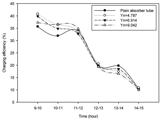 The charging efficiency is the ratio of hourly solar energy stored in the water storage tank to hourly solar energy collected, as given by Kumaresan et al. [13]. It is calculated using Equation (9), as follows