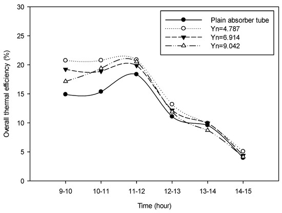 Figure 14 shows the variation in overall thermal efficiency of the CPCSWH with nail twist pitch ratio and time. In this figure, it is very obvious that the overall thermal efficiency of CPCSWH increases during the first 3 h of the experiment and after this time, it decreases continuously until 15:00 p.m. The peak values of overall thermal efficiency are observed between the time interval of 11:00 a.m. and 12:00 a.m. From this figure, it is also clear that smaller nail twist pitch ratio leads to a higher overall thermal efficiency. This is due to the swirl flow, induced by tape twist and the greater turbulence, created by the nail of the NTT. The combined effect increases the hourly solar energy stored and hence, increases the overall thermal efficiency. In the present experimental study, the maximum overall efficiency increased by 12.027% for a nail twist pitch ratio of 4.787, 7.697% for a nail twist pitch ratio of 6.914 and 10.697% for a nail twist pitch ratio of 9.042, compared to the same obtained from the plain absorber tube. Therefore, the overall thermal efficiency of the CPCSWH is influenced by nail twist pitch ratio and the smaller nail twist pitch ratio has a stronger influence than the higher nail twist pitch ratio.