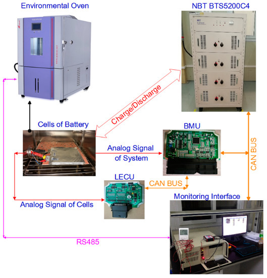 According to the algorithm model, a test bench for the cells was built, which included cells of the battery, charging and discharging equipment (NBT BTS5200C4, Newaresles Limited, Shenzhen, China), monitoring platform, environment oven, testing cable, the hardware of the battery management unit (BMU) and local electronic control unit (LECU), and communication cables. The test bench can not only conduct Hybrid pulse power characterization (HPPC) tests to identify the relevant parameters of the battery off-line but also it can be used for simulation and verification according to the condition of a real environment.