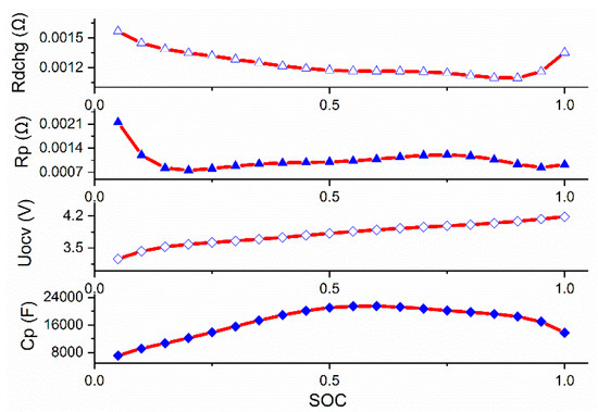 where the load current is represented with i (charge describes negative, discharge describes positive); the open-circuit voltage (OCV) is represented with ; and respectively denote the terminal voltage and the polarization voltage; and represent the polarization resistance and capacitance of the RC network, respectively; represents the internal resister voltage; and denote the internal resistance when the battery is charging or discharging, respectively.