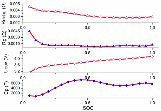 The HPPC test cycle of the battery cell is shown in Figure 4. There are various methods to fit functions in the MATLAB (R2016b, The MathWorks, Inc., Natick, MA, USA) simulation environment, such as polyfit command, is curvefit command, and cftool [55]. Among these methods, cftool is chosen to fit functions in this study, because it provides a visual graphical interface and powerful curve-fitting ability. The least square method [56] is used on the basis of the Formulas (1) and (2) to identify unknown parameters. The fitting curves of , and SOC equations are provided in Figure 5 (Temperature = 25 °C, SOH = 1) and Figure 6 (Temperature = 15 °C, SOH = 0.9). The coefficients of the corresponding equation () are indicated in Table 3 and Table 4.