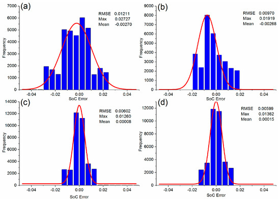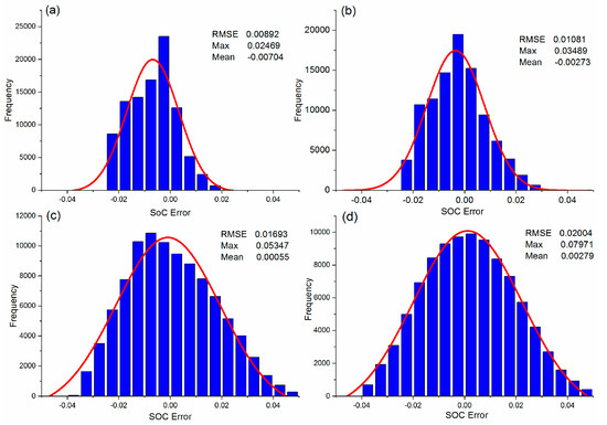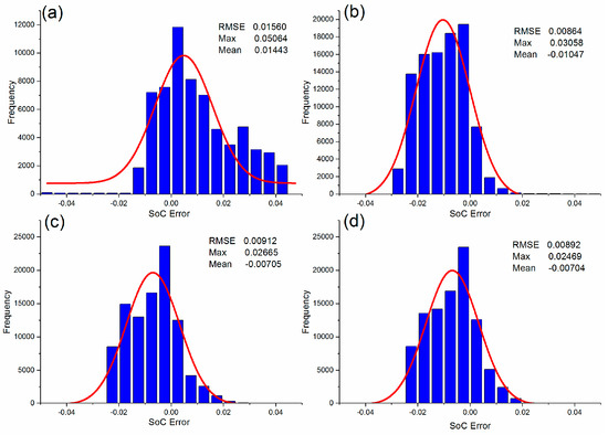 In this experiment, with a constant current of 34.95 A (approximately 1 C), the cell of the battery was discharged from the initial state (SOC = 1) to the final state (SOC = 0.00027). The voltage of terminal decreased from 4.14 V to 2.5105 V. The curve of the test is shown in Figure 7. The current of the battery is constant with the car running in a constant speed. Thus, this experiment can be used to simulate this condition. The experimental results of convergence speed are shown in Figure 8. The cyan line is the reference value of SOC calculated by the BTS5200C4 with a precise initial value of SOC, and the estimated SOC is described with the red line. The initial value of real SOC is 1, and the estimated one is 0.5. A comparison of results from the EKF, UKF, CKF, and SRCKF estimation algorithms are shown in Figure 8a–d, respectively. Figure 9 shows the estimation SOC errors of the EKF, UKF, CKF, and SRCKF estimation algorithms, and the results of probability of estimation SOC errors are shown in Figure 10. Table 6 shows the data of the root mean square errors (RMSE), mean errors, maximum errors, and convergence time. The estimation SOC errors of the EKF, UKF, CKF, and SRCKF estimation algorithms are shown in Figure 9a–d, respectively. Similarly, the results of the probability of estimation SOC errors of the EKF, UKF, CKF, and SRCKF estimation algorithms are shown in Figure 10a–d, respectively. From the experiment results of Experiment A, the following conclusions are obtained. Under constant current discharge, (1) the proposed method had a faster convergence rate in the case of a higher accuracy of SOC estimation than the other three methods; (2) the estimation SOC error of the proposed method was distributed in the small region near zero, which showed good stability of the SRCKF algorithm; and (3) the proposed method met the requirement of the constant current discharge condition.