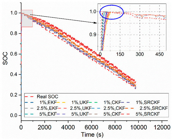 Under the same conditions, three different experiments were performed to test the performance of the proposed algorithm: constant current discharge test, dynamic stress test (DST), and DST test with noise measurement. At a temperature of 25 °C and SOH = 1, by using Figure 3 as the test bench, and the results of the battery parameters shown in Table 2, the EKF, UKF, CKF, and SRCKF algorithms were compared in the experiment. The comparison results were given in the performances of estimation accuracy, convergence speed, robustness, and calculation cost. Moreover, under real conditions, the actual current and voltage showed deviation from measured results due to the measurement errors of the voltage and current sensors and interference of corresponding hardware circuits (such as EMI). To verify the proposed algorithm robustness against the noise of measurement, a random interference to the system was conducted. Simulations of 100 cycles of the four algorithms were run in the Intel Core i7-4600U (2.1 GHz, 2.7 GHz, Intel Corporation, Santa Clara, CA, USA) to obtain the calculation cost of the algorithms. The test results are shown in Table 5. The comparison results showed that the proposed method had lesser computation cost than the other methods. Hence, because of the difference of calculation cost of the four algorithms, a cycle of the algorithms was run every 100 ms with BMU to ensure that the cycle was fully completed.