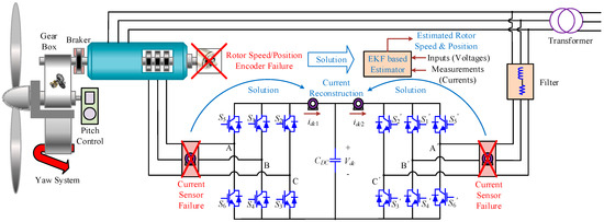 Doubly-fed induction generator based wind turbines (DFIG-WTs), due to their high efficiency, variable-speed constant-frequency (VSCF) operation, bidirectional power flow regulation capability, and small power electronic converter size, are widely installed, which takes over 50% of the total number of wind turbines all over the world [1,2,3,4]. Different from a fully rated wind energy conversion system (WECS), which is usually based on a permanent magnet synchronous generator (PMSG), the stator of DFIG-WT is directly connected to the grid, while the rotor is fed by a back-to-back (BTB) converter [5]. By employing this topology, the overall volume and cost of the power electronic converters are greatly reduced since only the slip power is to be regulated. However, a more complex control system is introduced. The rotor-side converter (RSC) and grid-side converter (GSC) are independently controlled, and the three-phase currents in the stator and GSC are separately measured, which means that more current sensors are equipped, adding to the hardware complexity. In addition, the rotor speed and position information should be captured by using a speed/position sensor. Therefore, the reliability of these sensors in the control system of DFIG-WT is of paramount significance to the normal operation of doubly-fed induction generator (DFIG) WECS.