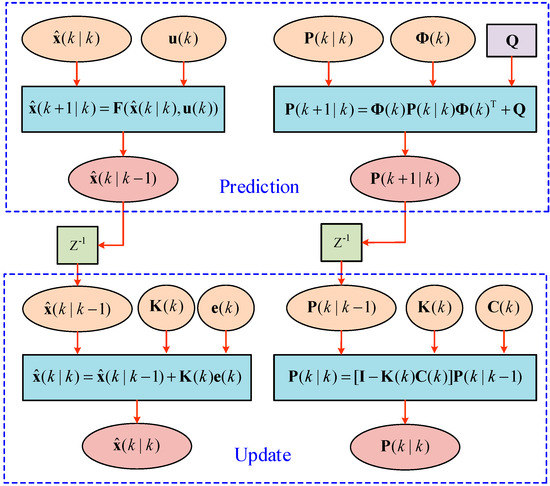 In Table 2, I is a unit matrix. The EKF algorithm with illustrations of the prediction and update steps is displayed in Figure 2.