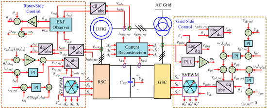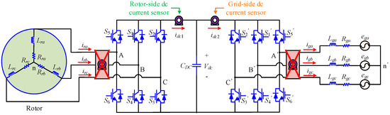 At the late stage of service time for DFIG-WT, phase current sensor failure at the RSC or GSC side is easy to happen. Traditionally, two phase current sensors are required at the AC side of RSC/GSC, and a DC-link current sensor is installed to prevent overcurrent. Considering the severe sensor failure case that the phase current sensors at both the RSC and GSC sides are not available, only one DC-link current sensor is applied for each converter to obtain the phase current information, as shown in Figure 3.