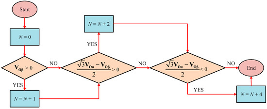 According to the algorithm presented in Figure 5, the value of sector indicator N can be calculated, and then the location of the output voltage vector VO will be determined.
