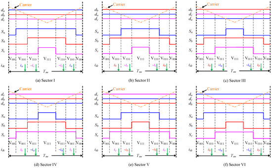 Similarly, the compensating duty ratio components for other duty ratios in different sectors are calculated in the same way as that in Equation (35). With the purpose of keeping the pulse width switching patterns symmetrical, only the largest and smallest duty ratios in a switching periods are to be adjusted, i.e., adding the complementary duty ratio component between the largest and medium duty ratios to the largest one, and subtracting that between the smallest and medium duty ratios from the smallest one. The details of duty ratio adjustment in each sector are illustrated in Table 5.
