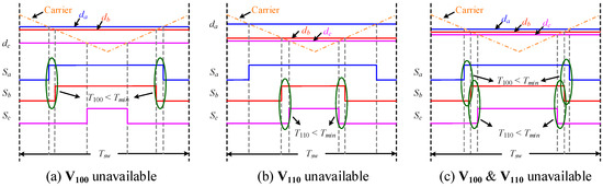Three current sampling failure cases in Sector I, when (a) V100 is not available (b) V110 is not available (c) both V100 and V110 are not available.