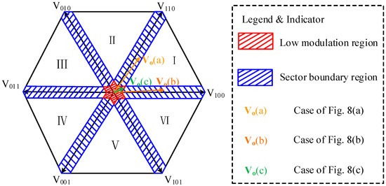 In Figure 8a, the action time of V100 is smaller than Tmin, and in this case the output voltage vector VO locates in the unmeasurable area at the boundary of Sector I and Sector II. When the situation described in Figure 8b occurs, VO locates in the sector boundary area between Sector I and Sector VI. In addition, when the output voltage vector is in the low modulation region, the corresponding PWM switching patterns are shown in Figure 8c, where no sampling points are presented in a switching period. The current reconstruction dead zones including the sector boundary region and low modulation region in the space vector diagram are depicted in Figure 9, with the cases in Figure 8 illustrated.