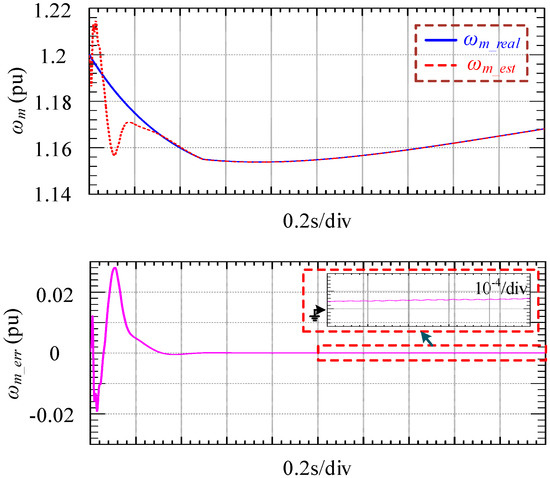 It can be seen in Figure 17 that, at the beginning, the rotor speed estimation deviates from the real value by around 0.2 pu, which is large compared to the initial rotor speed of 1.2 pu. However, in around 0.3 s, the tracking performance is good enough for the estimated rotor speed to replace the real one since the difference between them is only about 4 × 10−5 pu, regardless of the wind speed step change. In addition, the estimated rotor position is almost equal to the real one, which can be observed in Figure 18. It should be noted that the range of rotor angular position is [0, 2π]. Although the error displayed in Figure 18 is approximately 6.271 rad, it can also be expressed as (6.271 − 2π) rad, whose absolute value is only 0.0122 rad, since the rotor position is a periodic function of time. Therefore, the estimated rotor position is accurate enough for sensorless control of DFIG-WT. To demonstrate the mechanical performance of DFIG-WT, the mechanical and electromagnetic torques are displayed in Figure 19.